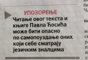 „Нова књигa Павла Ћосића представља вредан допринос нормативистици и неку врсту наставка и слике у огледалу Клајновог Речника језичких недоумица. Обе ове књиге представљају пописе типичних језичких грешака, само што се Иван Клајн обраћа говорницима српског језика који траже одговоре за своје недоумице са свешћу да не знају решењa, док се Павле Ћосић обраћа онима који себе сматрају језичким експертима и који агресивно и с најдубљим уверењем заступају непостојећа језичка правила, а, у ствари, подједнако не познају језичку норму као и они који су свесни свог незнања. Раскринкавајући језичке митове, Павле Ћосић на духовит и забаван начин указује на њихово постојање, али и на склоност неких говорника српског језика да их упорно заступају у јавности, преносе и да их бране по сваку цену.”